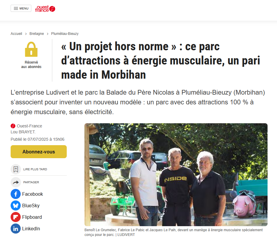 Actualités de Ludivert LA GAZETTEMorbihan : Ludivert Lire l’article LE TELEGRAMMEFabriquer des manèges à énergie musculaire Lire l’article OUEST FRANCEUn projet hors norme Lire l’article Vous recherchez d’autres idées d’attraction pour parc de loisirs ?Plus de choix